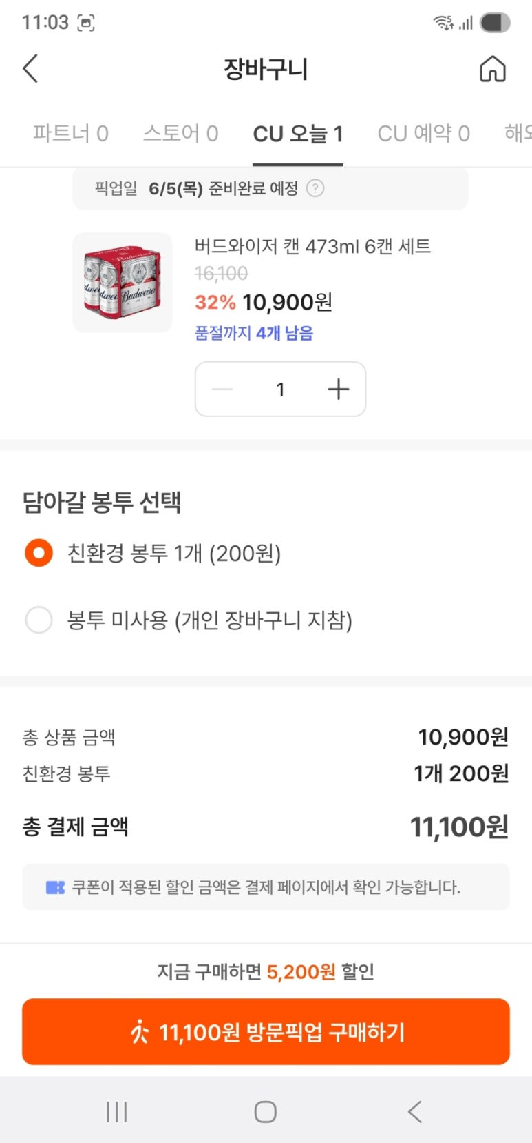 버드와이저 6캔 주문시 이렇게 친환경봉투(200원)를 선택하면 11,000원 되서 포인트와 쿠폰을 모두 적용할수 있어요 (10,900원일때는 1,000원 할인쿠폰 적용하면 9,900원이 되서 3,000포인트 적용을 못해요) 그래서 친환경봉투로 하는거에요